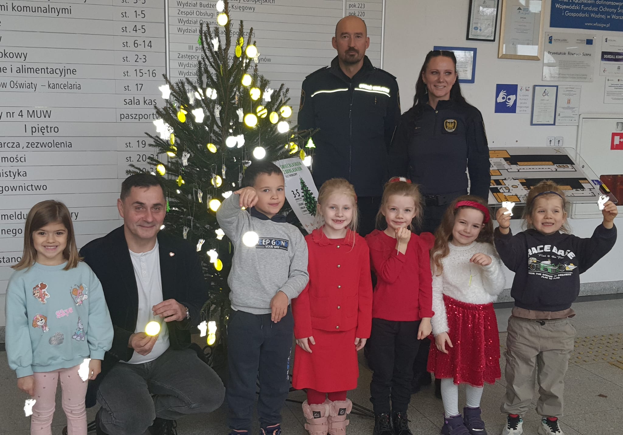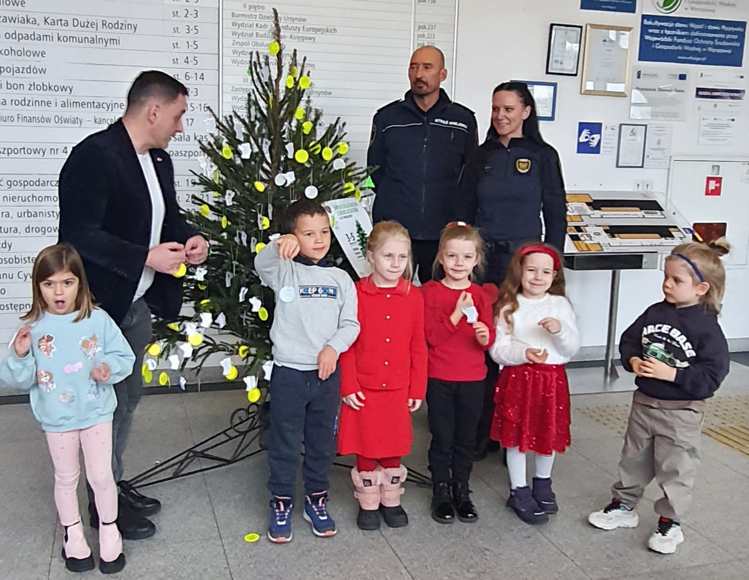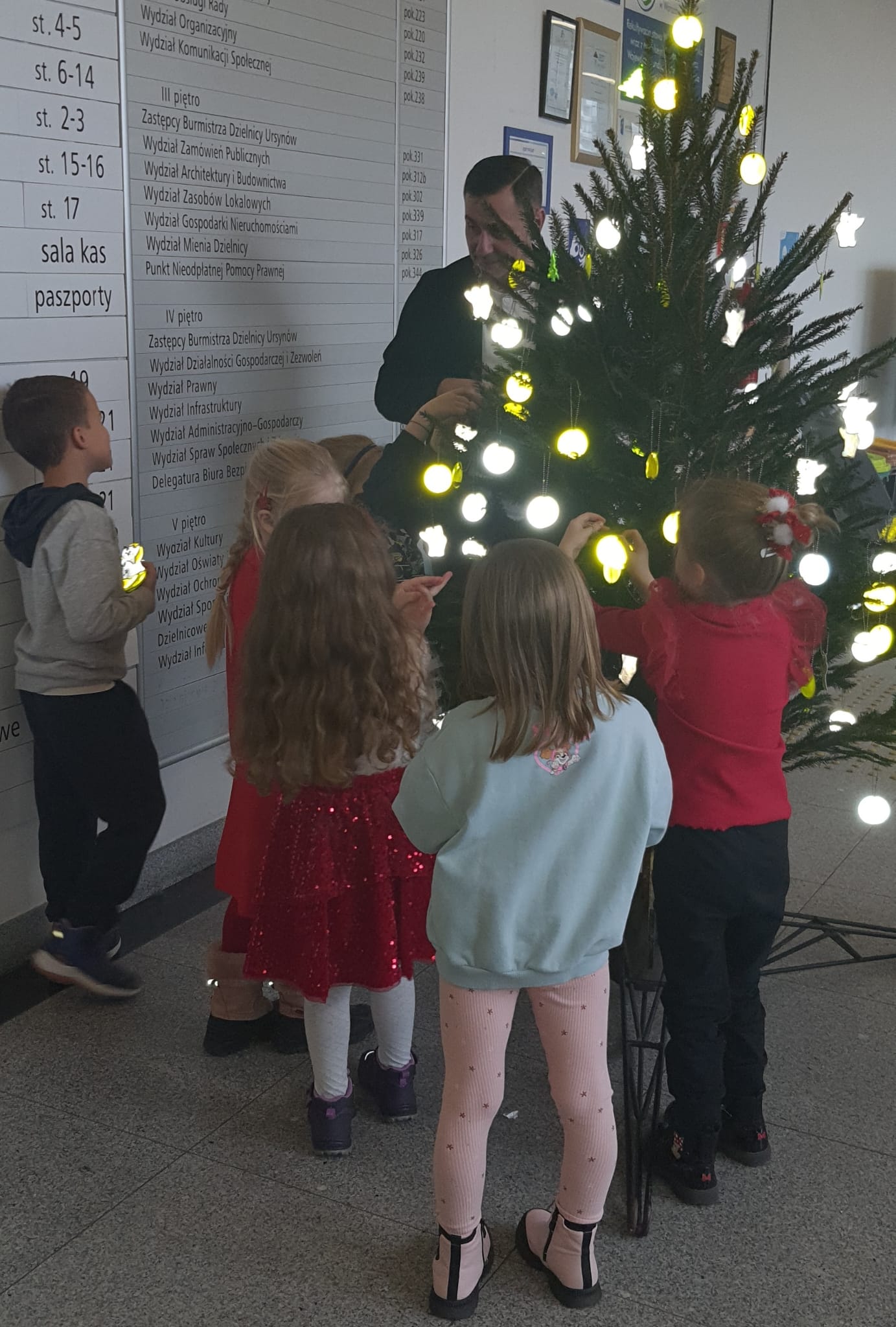Dzisiaj nasi dzielni przedszkolni delegaci z grup: Motylki, Smerfy i Misie wzięli udział w wyjątkowym wydarzeniu – wspólnie przystroili świąteczną Choinkę w Urzędzie Dzielnicy. Towarzyszyli im przedstawiciele Straży Miejskiej, którzy z życzliwością wspierali dzieci w całym przedsięwzięciu, oraz Pan Burmistrz Robert Kempa, dodając uroczystości szczególnego charakteru.
