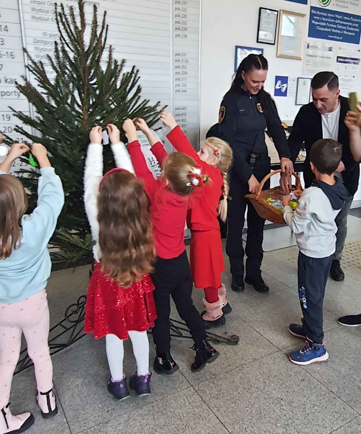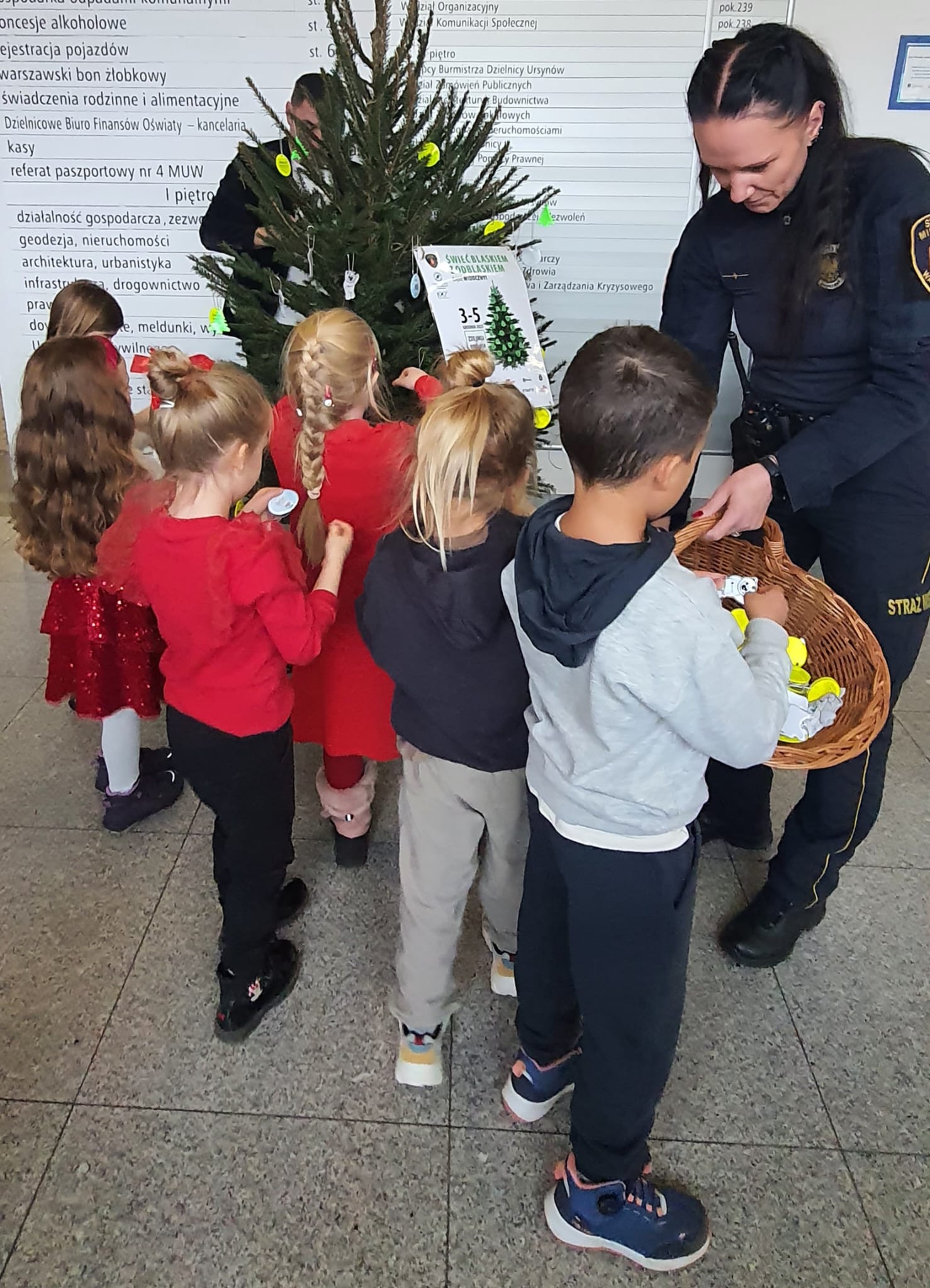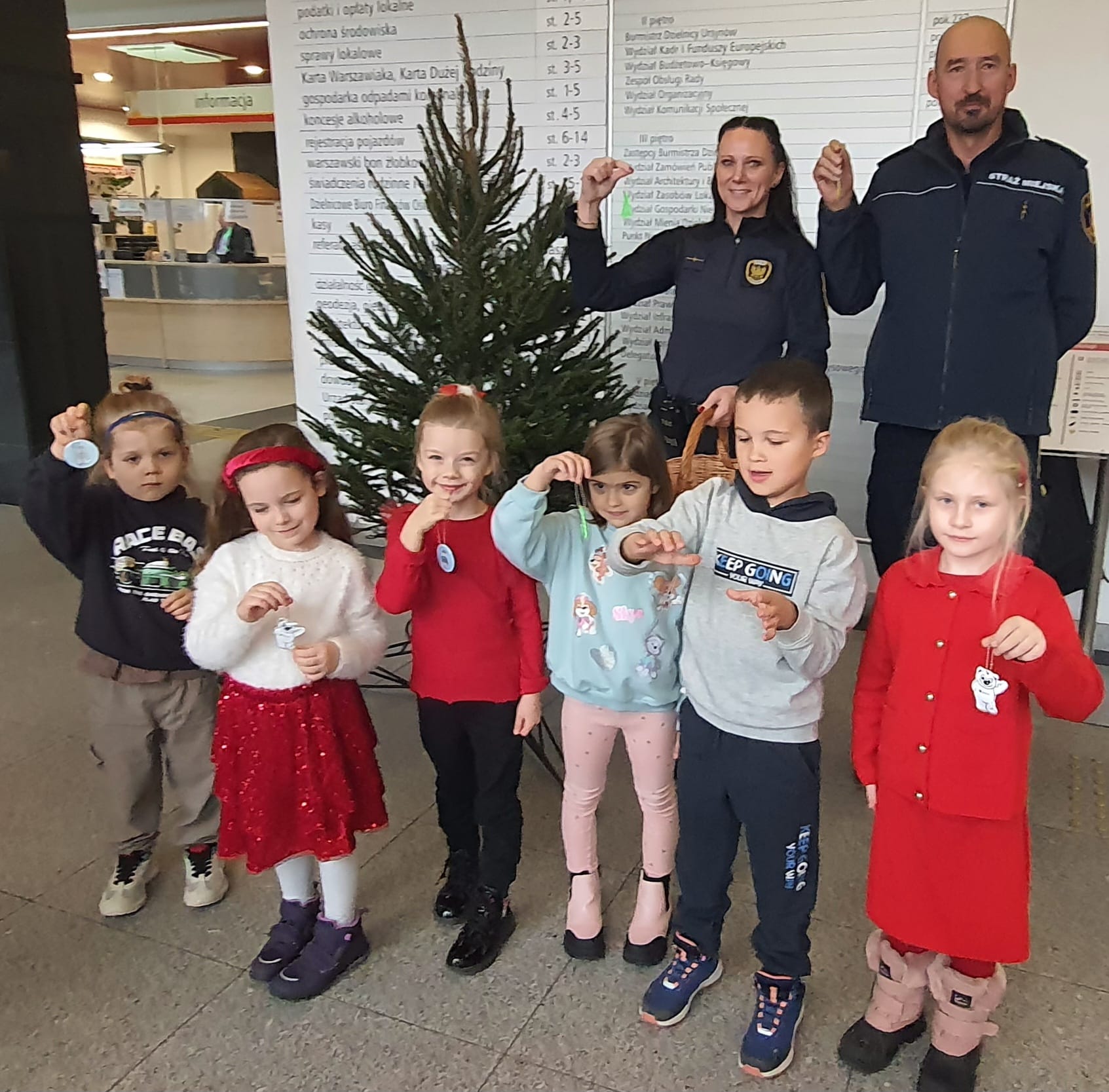 Dzisiaj nasi dzielni przedszkolni delegaci z grup: Motylki, Smerfy i Misie wzięli udział w wyjątkowym wydarzeniu – wspólnie przystroili świąteczną Choinkę w Urzędzie Dzielnicy. Towarzyszyli im przedstawiciele Straży Miejskiej, którzy z życzliwością wspierali dzieci w całym przedsięwzięciu, oraz Pan Burmistrz Robert Kempa, dodając uroczystości szczególnego charakteru.